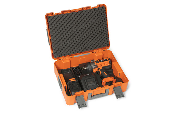 Кейс выполнен из прочного пластика в виде систейнера с замками, обеспечивающими быструю и надежную установку кейсов один над другим, что облегчает транспортировку и способствует экономии пространства для хранения. Отдельный отсек на корпусе кейса позволяет удобно переносить необходимую оснастку.